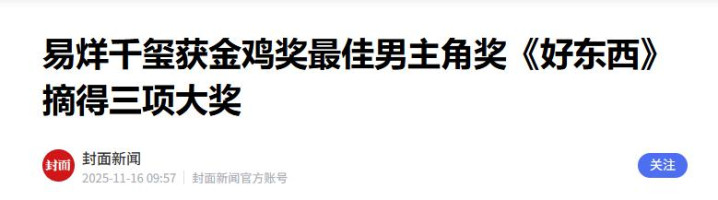封面新闻2025-11-16 09:57易烊千玺获金鸡奖最佳男主角奖《好东西》摘得三项大奖